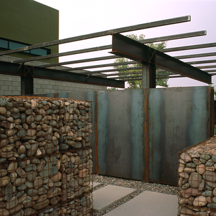 The design incorporates four intimate courtyards which help create microclimates within the same lot while numerous glass doors pivot or slide open, allowing for some sections of the home to be completely operable and fosters an indoor/outdoor connection. The private entry court is screened with river rock gabion walls, while the exercise court is screened by rusted steel walls, a master bedroom court is screened by concrete block walls, and a pool courtyard is screened by a cast-in-place concrete wall that also doubles as the pool’s water feature.