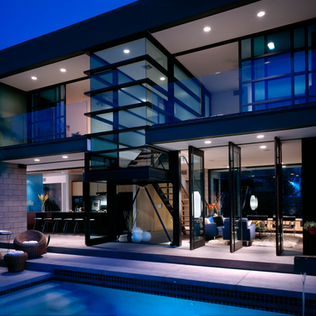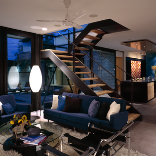 The home is simple and elegant in its architectural character, employing exposed CMU and an abundance of glazing at the internal courtyards. Other materials include maple cabinetry, plate steel walls, exposed integral color concrete floors and aluminum and glass doors and windows.